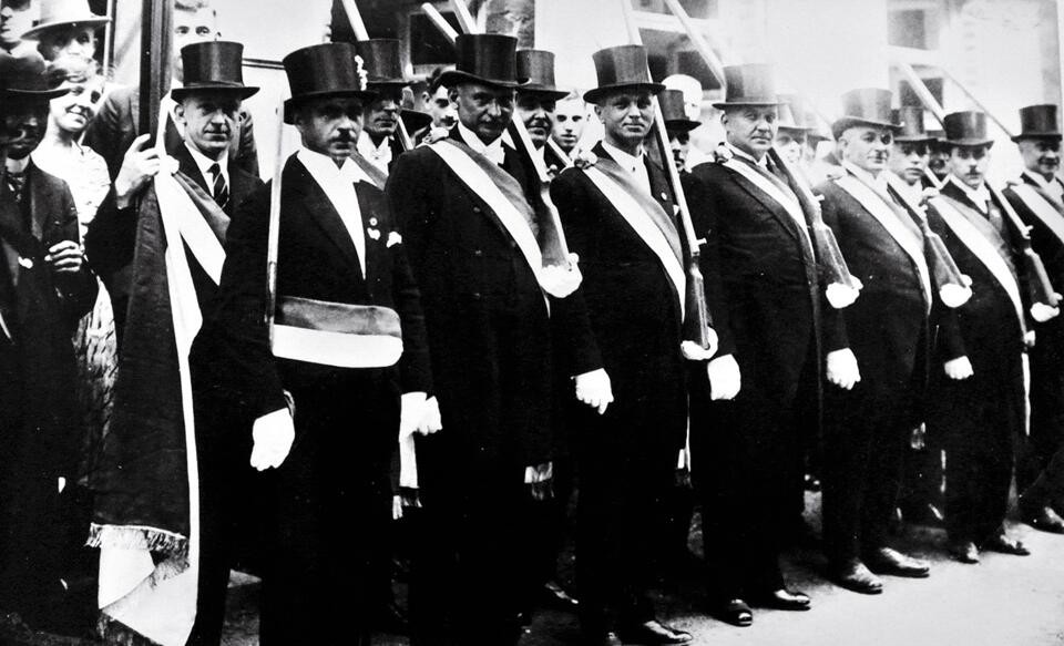 Vorheriges BildNächstes Bild 1931 – Beecker Honoratioren 1931 Beecker Honoratioren: Hubert Vossen (links mit Fahne), Schmeier (2.v.l.), Franz Bertrams (5.v.l.), Franz Merzbach (6.v.l.), Anton Heinen (8.v.l.)
