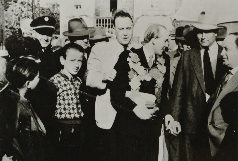 Vorheriges BildNächstes Bild 1954 – König Lothar Schlagheck nach dem Vogelschuss 1954 Lothar Schlagheck wird Schützenkönig. Dahinter Günther Groß, rechts Karl Gawrich und Hubert Rommerskirchen
