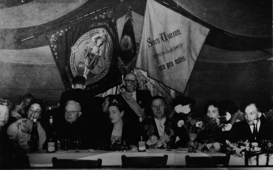 Vorheriges BildNächstes Bild 1957 – Am Königstisch 1957 Am Königstisch: Maria Ostermann, Pfarrer Wilhelm Plum, Königspaar Willi und Maria Wimmers, Luise und Lothar Schlagheck