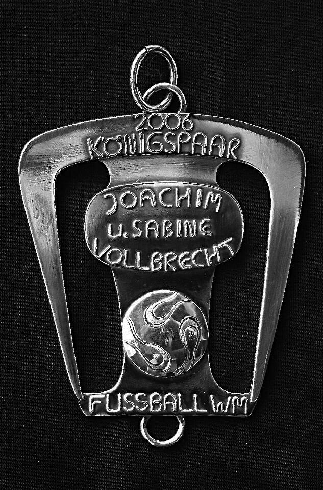 Vorheriges Bild 2006 – Königsplakette Die Königsplakette von Joachim Vollbrecht zeigt einen FIFA-Fussball zur Erinnerung an ein „Sommermärchen“ in Beeck und die Fußballweltmeisterschaft 2006 in Deutschland.