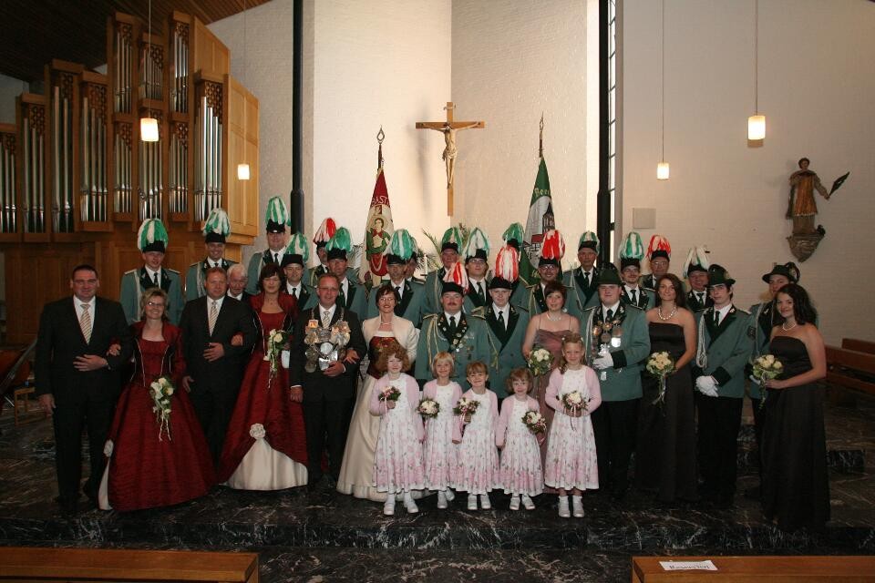 Vorheriges BildNächstes Bild 2009 – Pfingsten – Gruppenbild Kirche Ein Gruppenbilder der Majestäten mit Fähnrichen und Stabsoffizieren nach der Messe