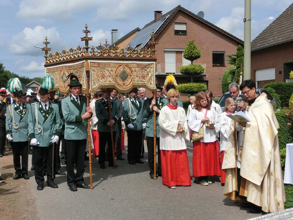 Vorheriges BildNächstes Bild 2013 – Fronleichnamsprozession 2012 Fronleichnam. Pfarrer Huu Duc Tran mit Begleitung der St. Sebastianus Schützenbruderschaft Beeck