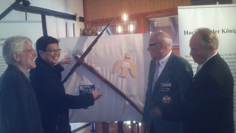 Nächstes Bild 2013 – Ausstellung – Armbrust Heinz Schlömer, Pfarrer Huu Duc Tran, Bundesbrudermeister Heinzgerd Dewies und Brudermeister Herbert Fervers
