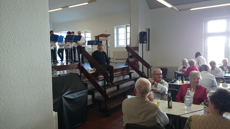 Vorheriges BildNächstes Bild 2014 – Seniorentag (7) Karl Bertrams Eine Pause für Karl Bertrams. Im Hintergrund macht sich das Trommlerkorps für die nächsten Stücke bereit.