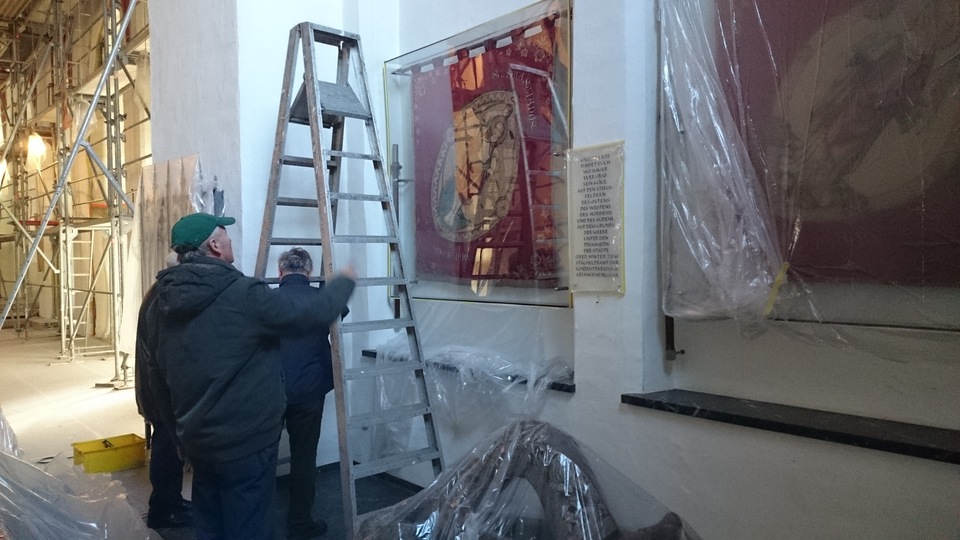 Vorheriges Bild 2015 – Renovierung alte Kirche – Fahnen Herbert Fervers, Dieter Lencer und Jakob Gerads hängen die erste Fahne ab