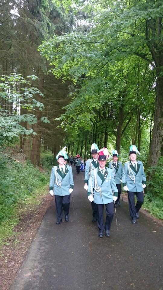 Vorheriges BildNächstes Bild 2016 – Diözesanfest Reifferscheid (DSC_0029) Die durch den amtierenden Zugführer des ersten Zugs verstärkten Königsoffiziere auf den letzten Metern im Wald