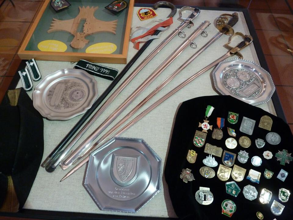 Vorheriges Bild 2013 – Ausstellung – Seitenwaffen In dieser Vitrine war ein Sammelsurium. Der Prinzenvogel von 1992, Aufnäher der Jägerzüge und Bruderschaft, Teller und Festabzeichen, Säbel, Stock und Zweispitz.
