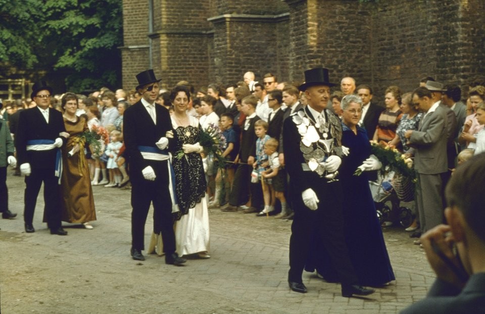 Vorheriges BildNächstes Bild 1963 – Vorbeimarsch Königsgefolge Peter Corall Vorbeimarsch Königsgefolge Peter Corall auf dem Kirchplatz im Jubiläumsjahr
