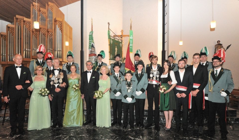 Vorheriges BildNächstes Bild 2014 – Königsgefolge – Gruppenbild Kirche Gruppenbild des Königs-, Prinzen- und Schülerprinzgefolges mit Adjutanten und Fähnrichen in der Beecker Gemeindekirche St. Vincentius
