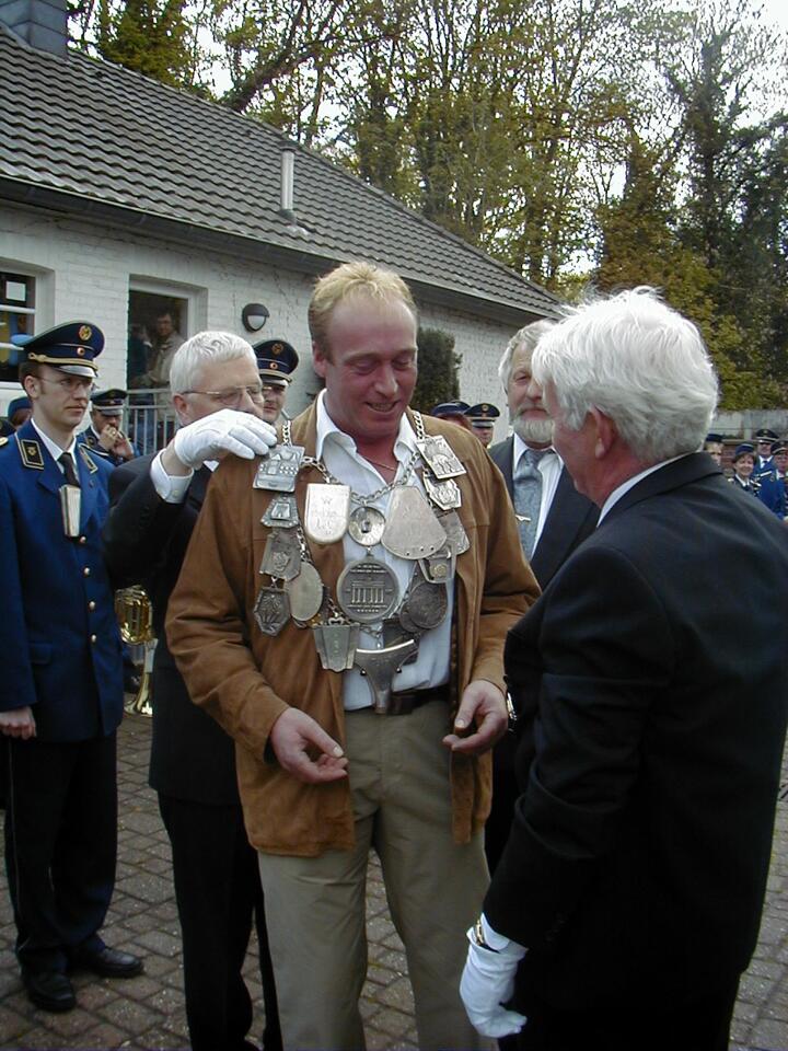 Vorheriges BildNächstes Bild 2001 – König Johannes Olland 2001 Johannes Olland ist neuer Schützenkönig. Dahinter Karl Heinz Pape, im Vordergrund Pater Franz.
